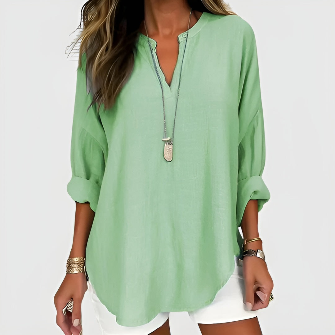Sofie™-blusen er lavet af åndbart hør, der holder dig kølig og komfortabel, selv på varme dage. Den løse pasform og den elegante blå farve gør denne bluse velegnet til forskellige lejligheder, fra en dag på stranden til en aften ude.