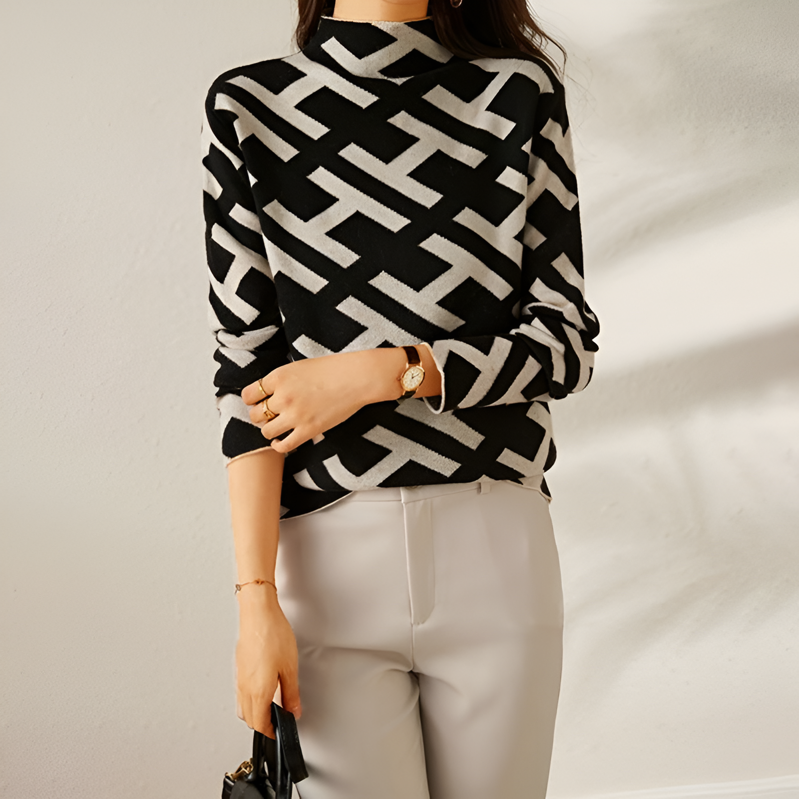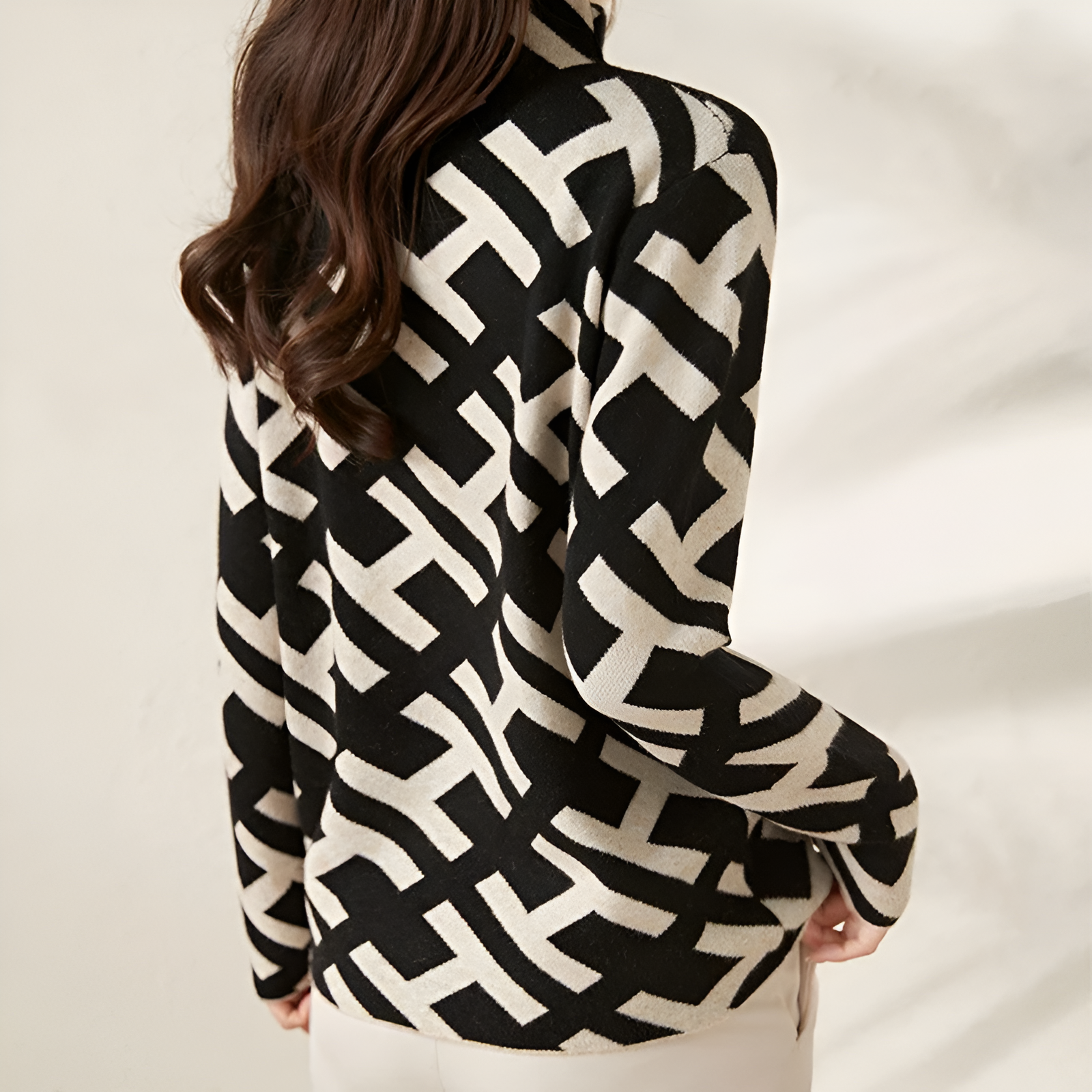 Luka™ er skabt til kvinder, der ønsker et moderne og selvsikkert look. Det grafiske mønster giver et markant udtryk, mens det bløde materiale føles behageligt og varmt. Ideel til efterår og vinter – både til arbejde og fritid.